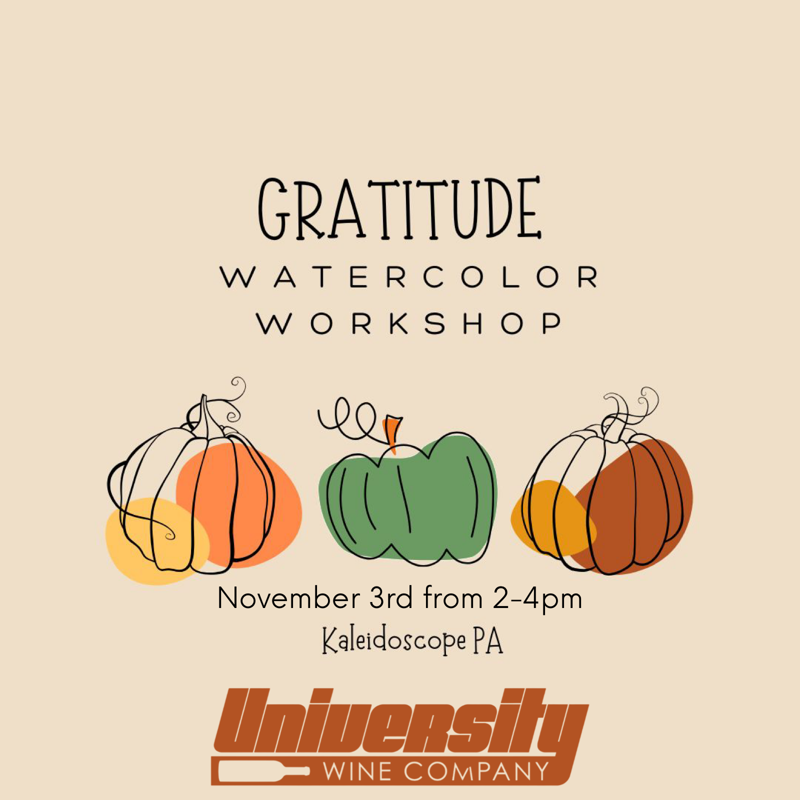 Gratitude Watercolor Workshop Sunday, November 3, 2024 2:00 PM 4:00 PM 14:00 16:00 University Wine Company 540 Misty Hill Drive State College, PA, 16801 United States (map) Google Calendar ICS