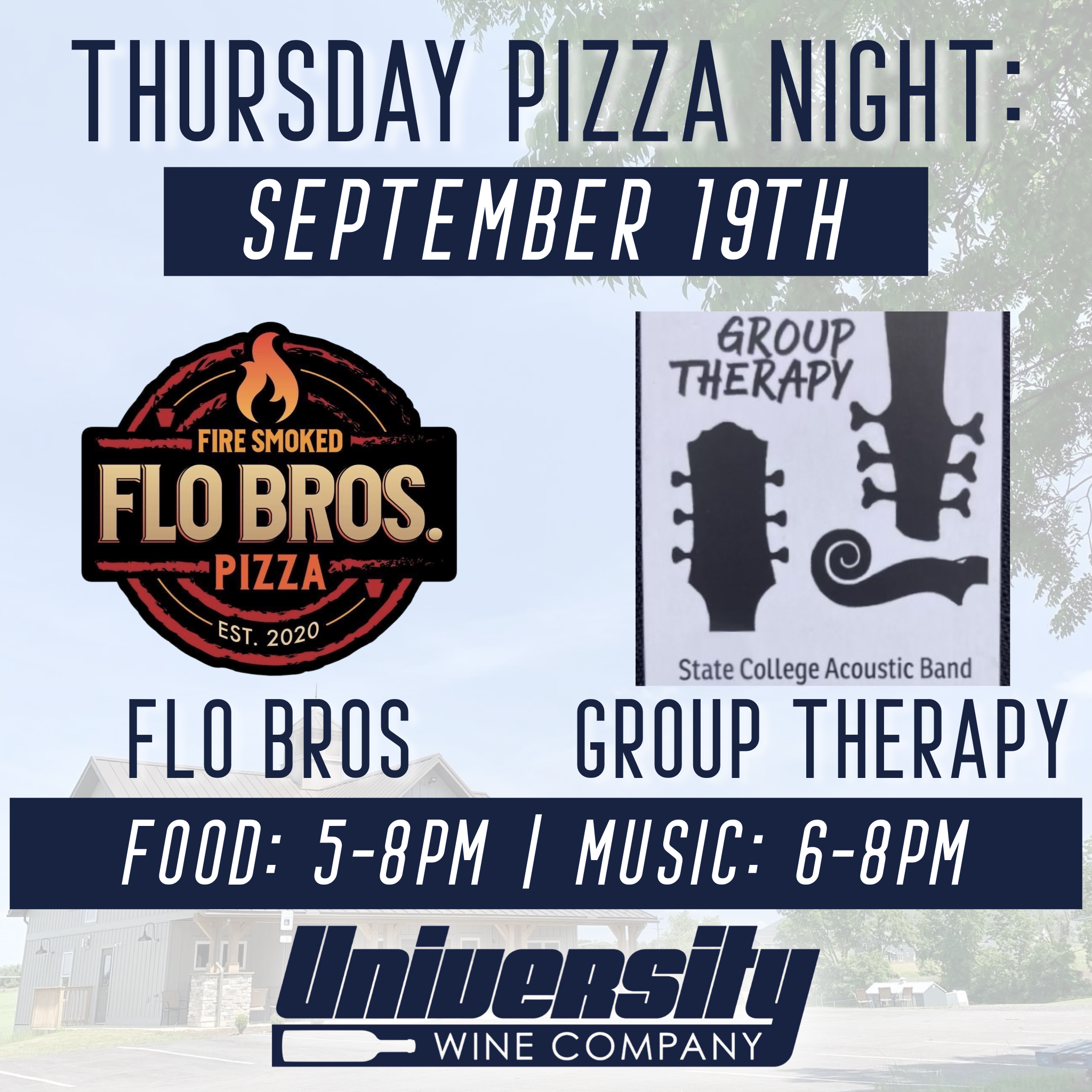 Thursday Pizza Night Thursday, September 19, 2024 5:00 PM 8:00 PM 17:00 20:00 University Wine Company 540 Misty Hill Drive State College, PA, 16801 United States (map) Google Calendar ICS