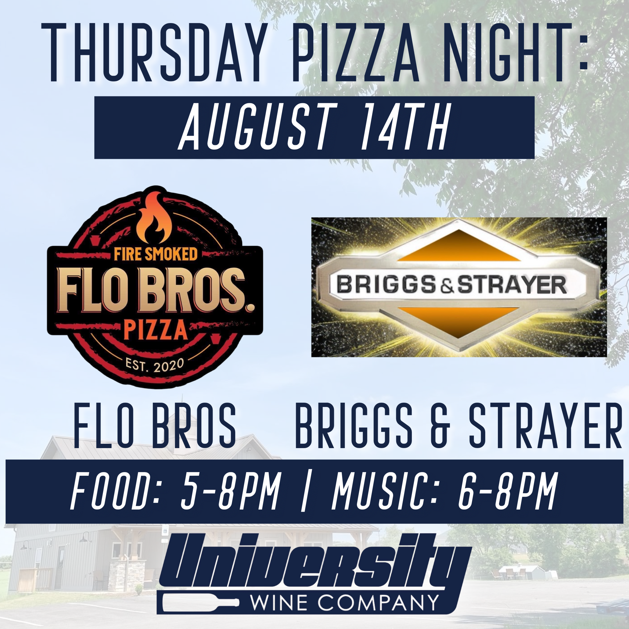Thursday Pizza Night Thursday, August 14, 2025 5:00 PM 8:00 PM 17:00 20:00 University Wine Company 540 Misty Hill Drive State College, PA, 16801 United States (map) Google Calendar ICS